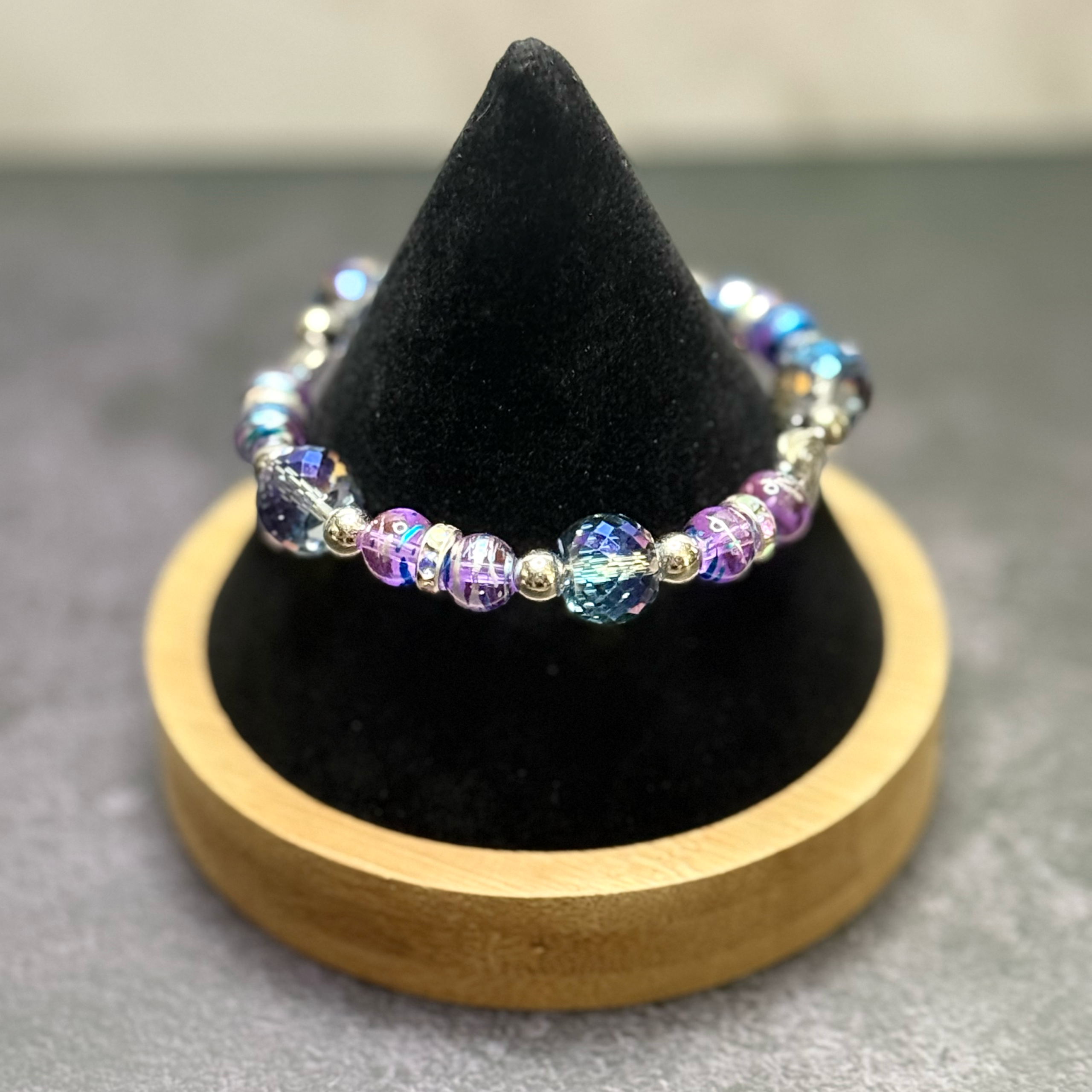 Purple w/blue, rhinestone and silver heart beads